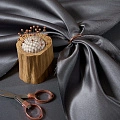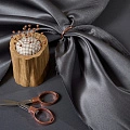 По своей структуре атлас прокатный это плотная атласная ткань с матовой лицевой поверхностью, которая тем не менее обладает свойством "сиять" практически при любом освещении. Ткань не обсыпается по краям, проста в обработке и абсолютно не эластична. В прокатном атласе нет никакого запаса стрейча, поэтому пошитые из него платья не потеряют свою форму и не растянутся.