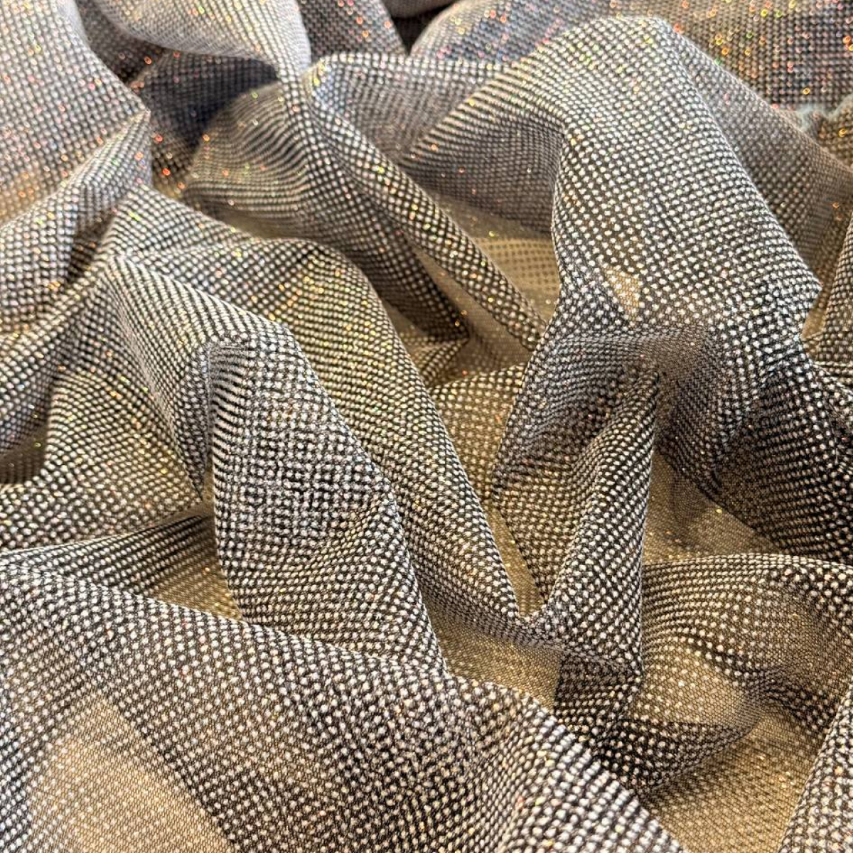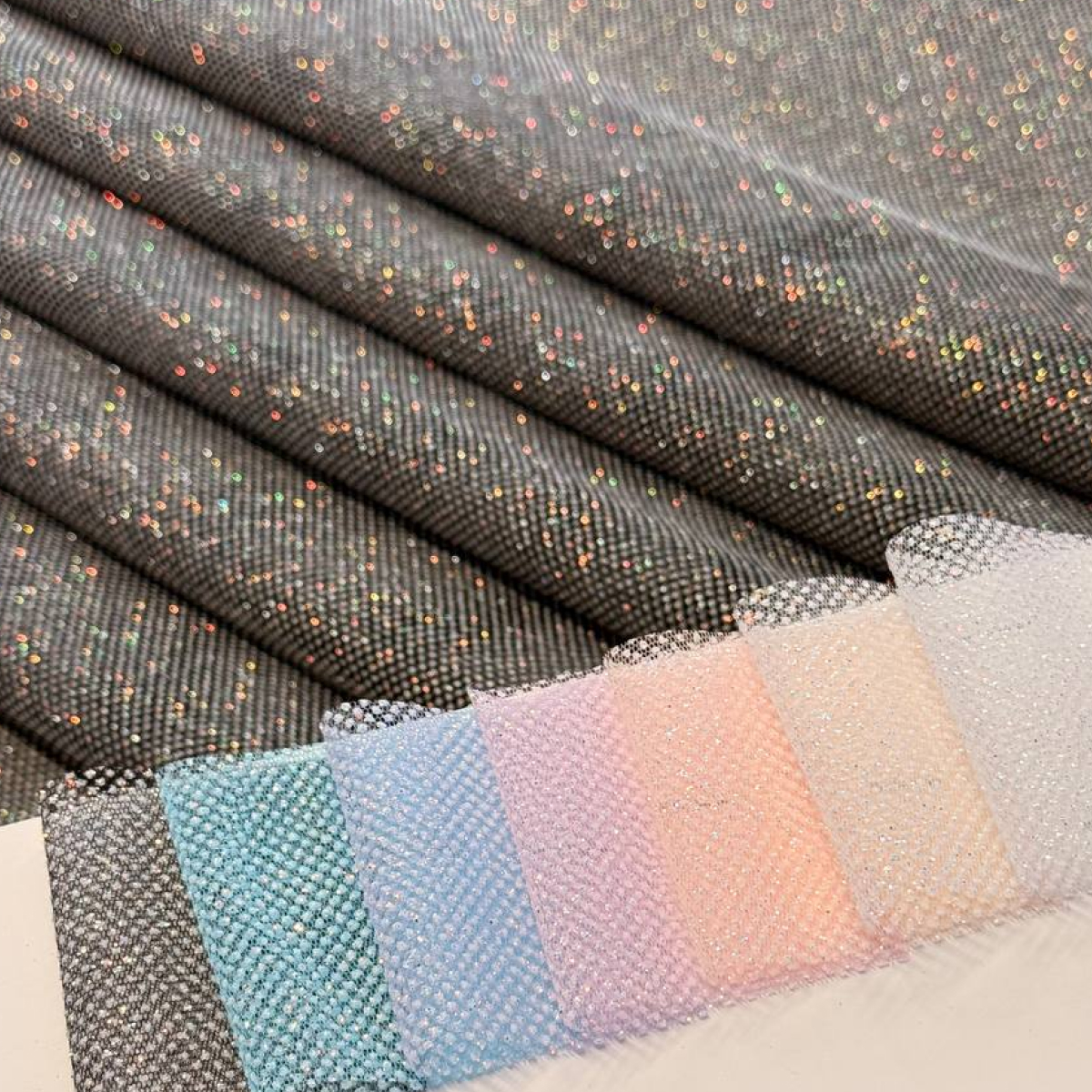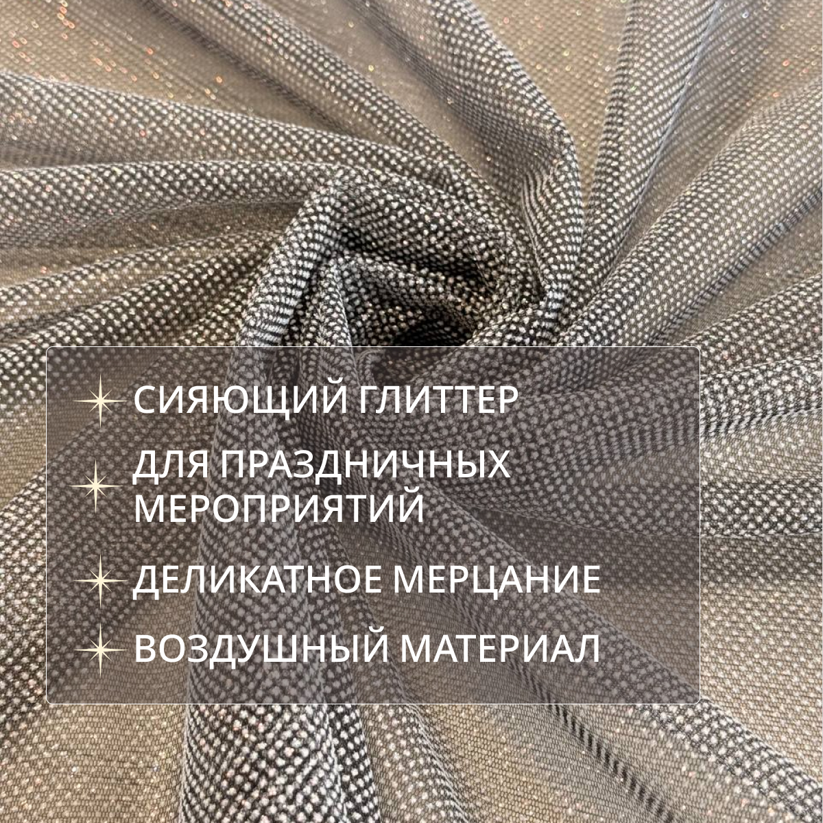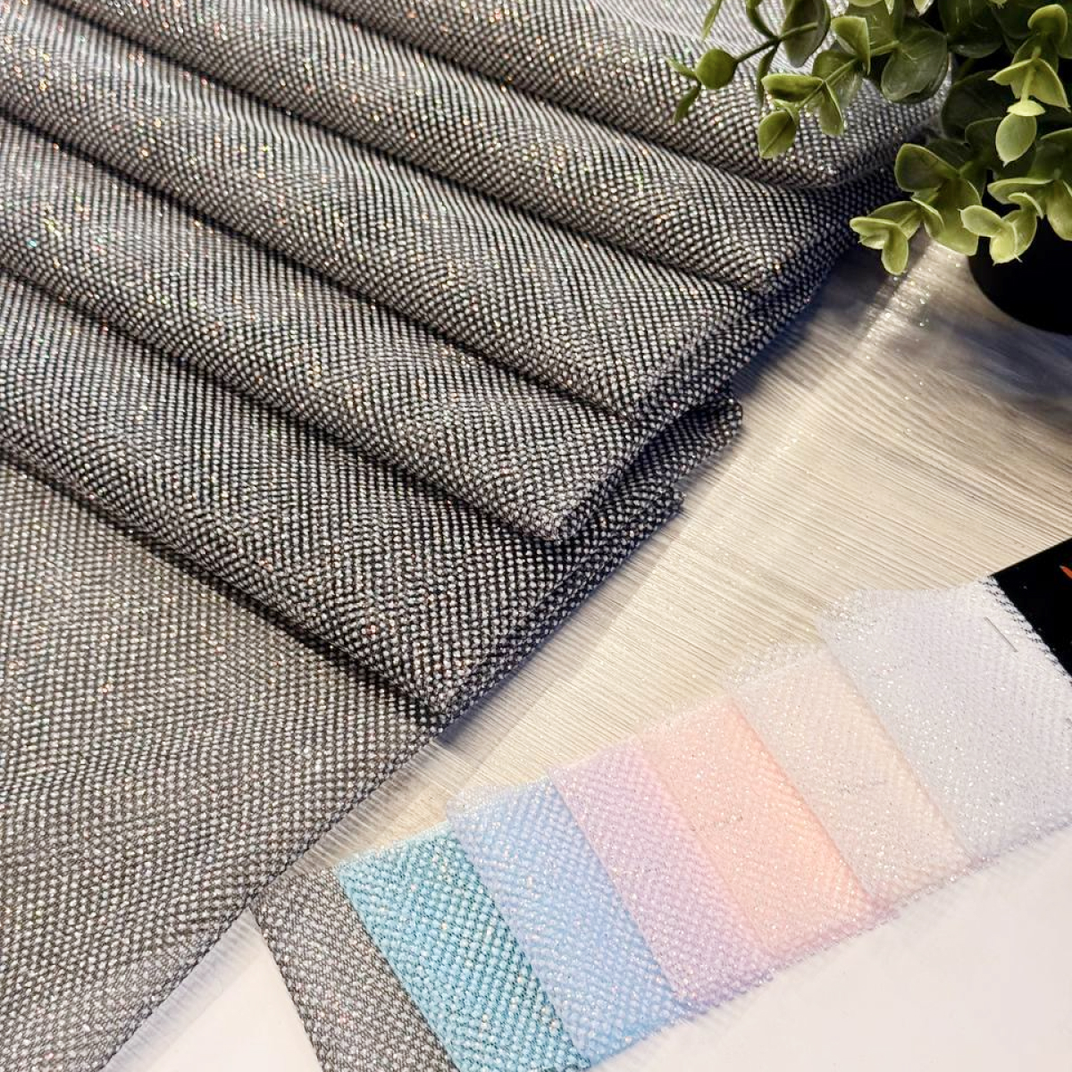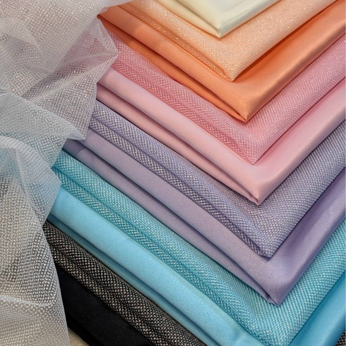 Фатин  с мерцающим глиттером — это воплощение изысканного свадебного стиля. Мягкий с деликатным напылением создает эффект «живой» ткани, которая мягко переливается при каждом движении. Благодаря мягкой основе, этот материал становится идеальным выбором для создания многослойных свадебных юбок, изысканных фат и праздничных нарядов, где важна гармония между блеском и нежностью.