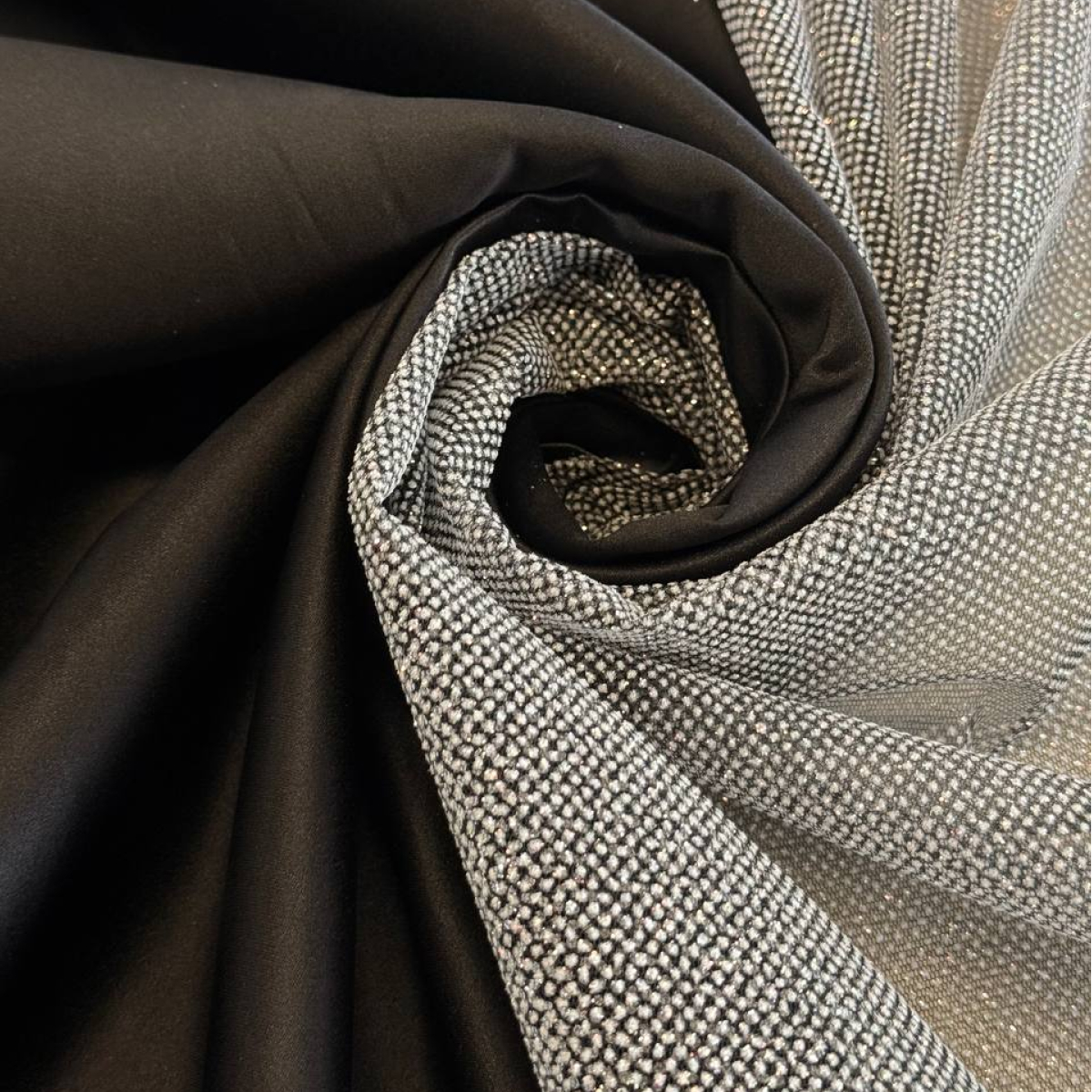 Материал отличается исключительной пластичностью: он послушно ложится в текучие драпировки, не создает лишнего объема и позволяет формировать летящие, воздушные силуэты с благородным свечением.