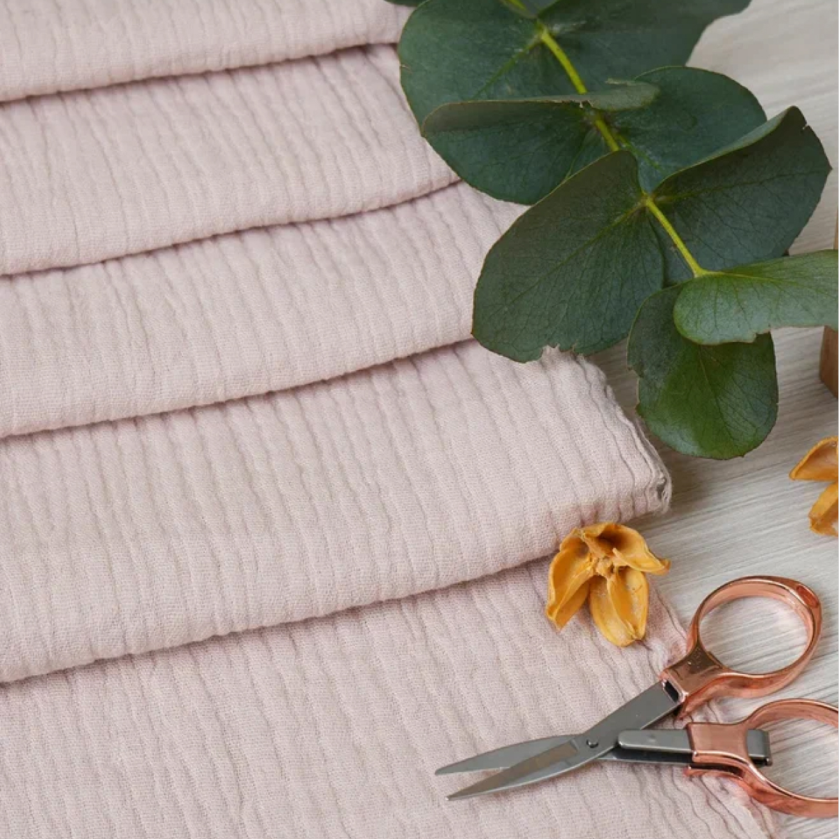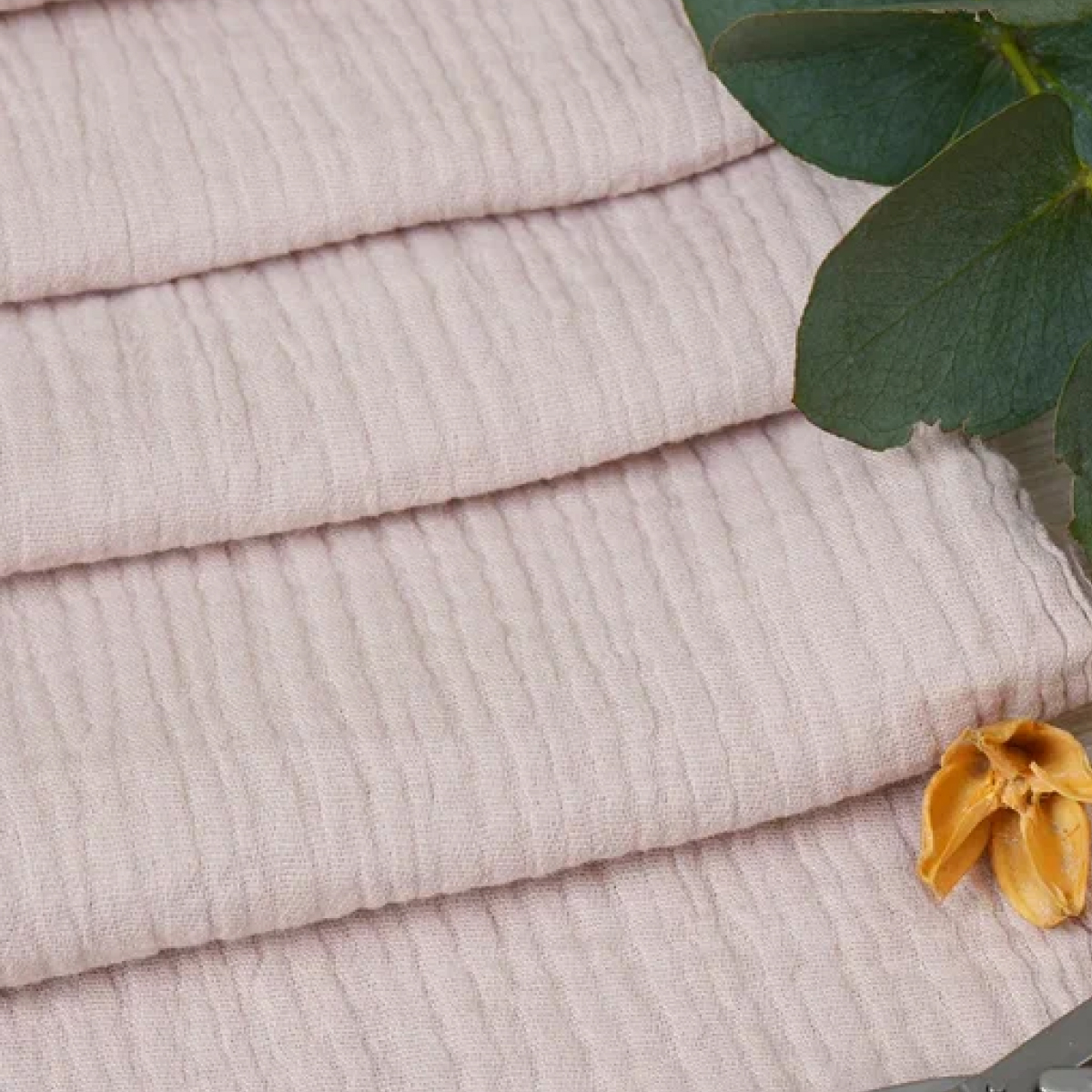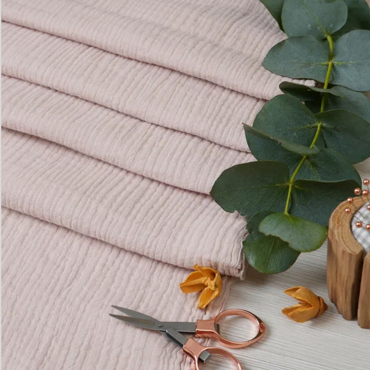 Муслин с двойной нитью  жатый — это очень нежный эко-хлопок для пошива воздушных летних платьев для взрослых и для детей, легких костюмов, мужских рубашек, стильных блуз, легких и мягких детских пеленок, комплектов постельного белья (покрывало, наволочки). Эта натуральная, полупрозрачная ткань идеальна для летней поры, она легкая и воздухопроницаемая.