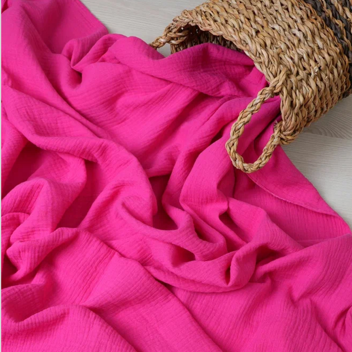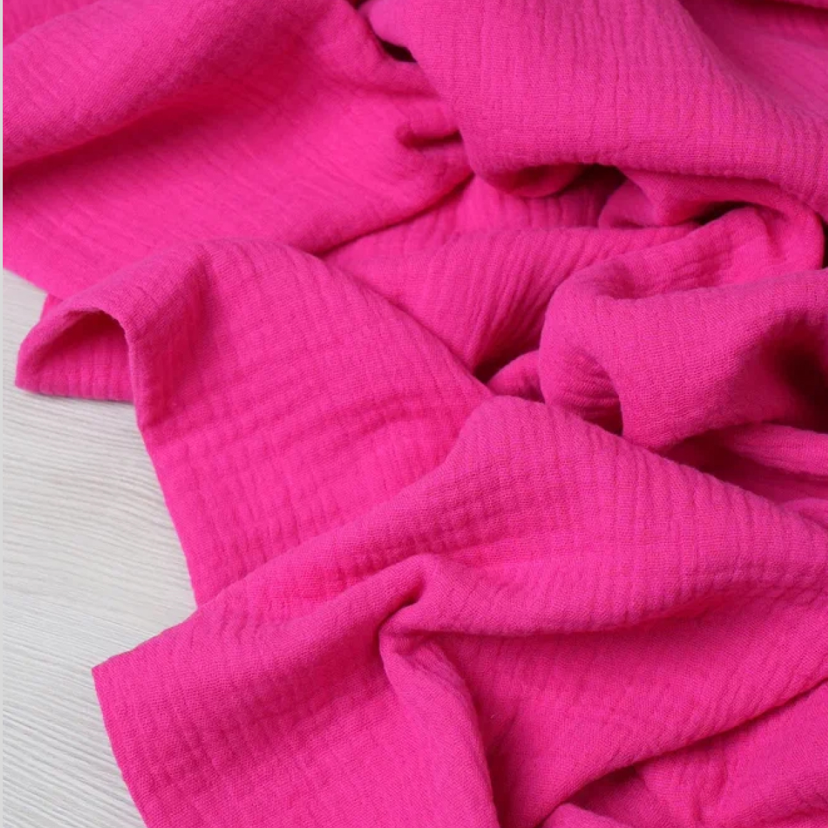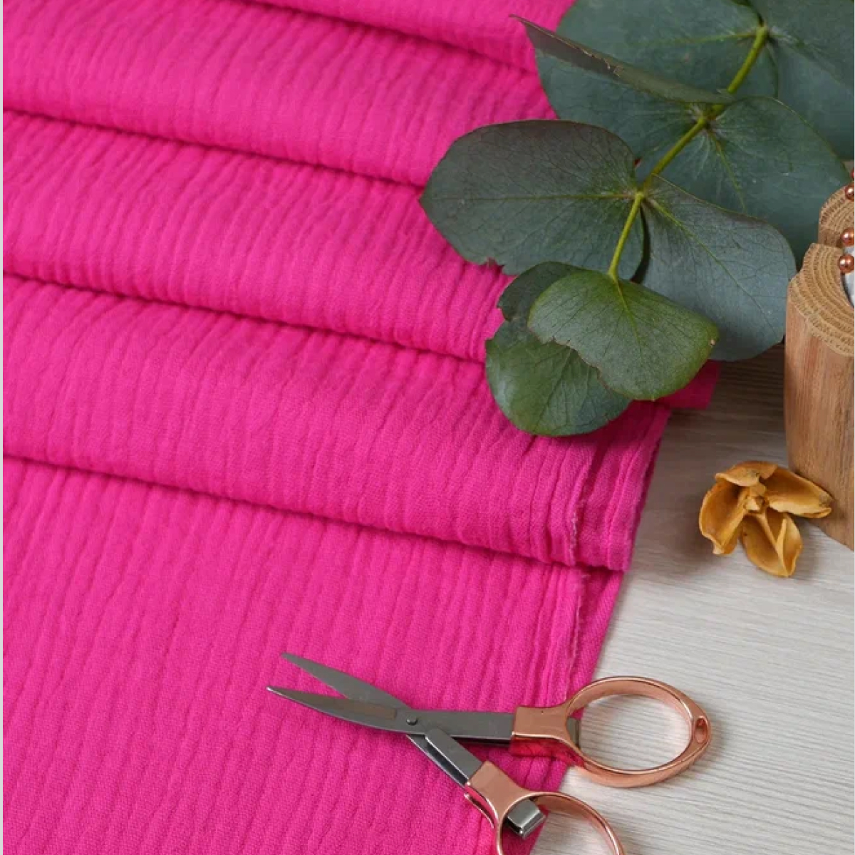 Муслин с двойной нитью  жатый — это очень нежный эко-хлопок для пошива воздушных летних платьев для взрослых и для детей, легких костюмов, мужских рубашек, стильных блуз, легких и мягких детских пеленок, комплектов постельного белья (покрывало, наволочки). Эта натуральная, полупрозрачная ткань идеальна для летней поры, она легкая и воздухопроницаемая.