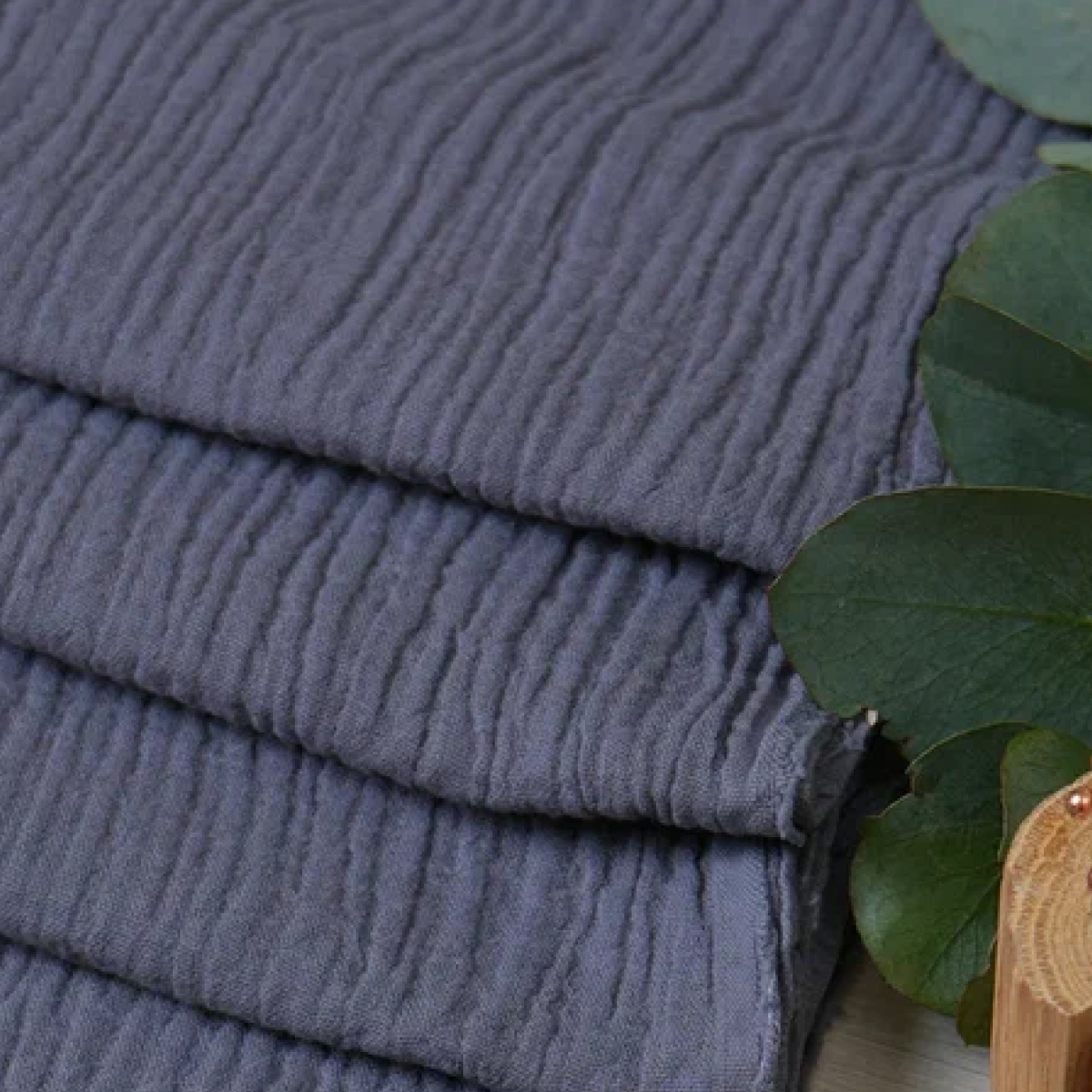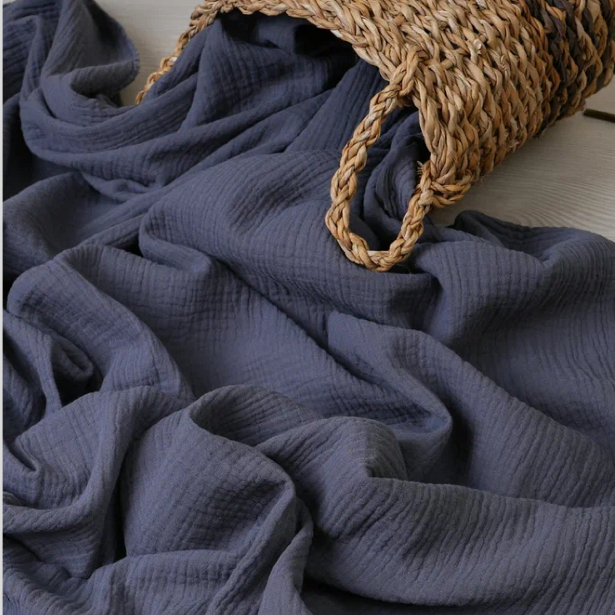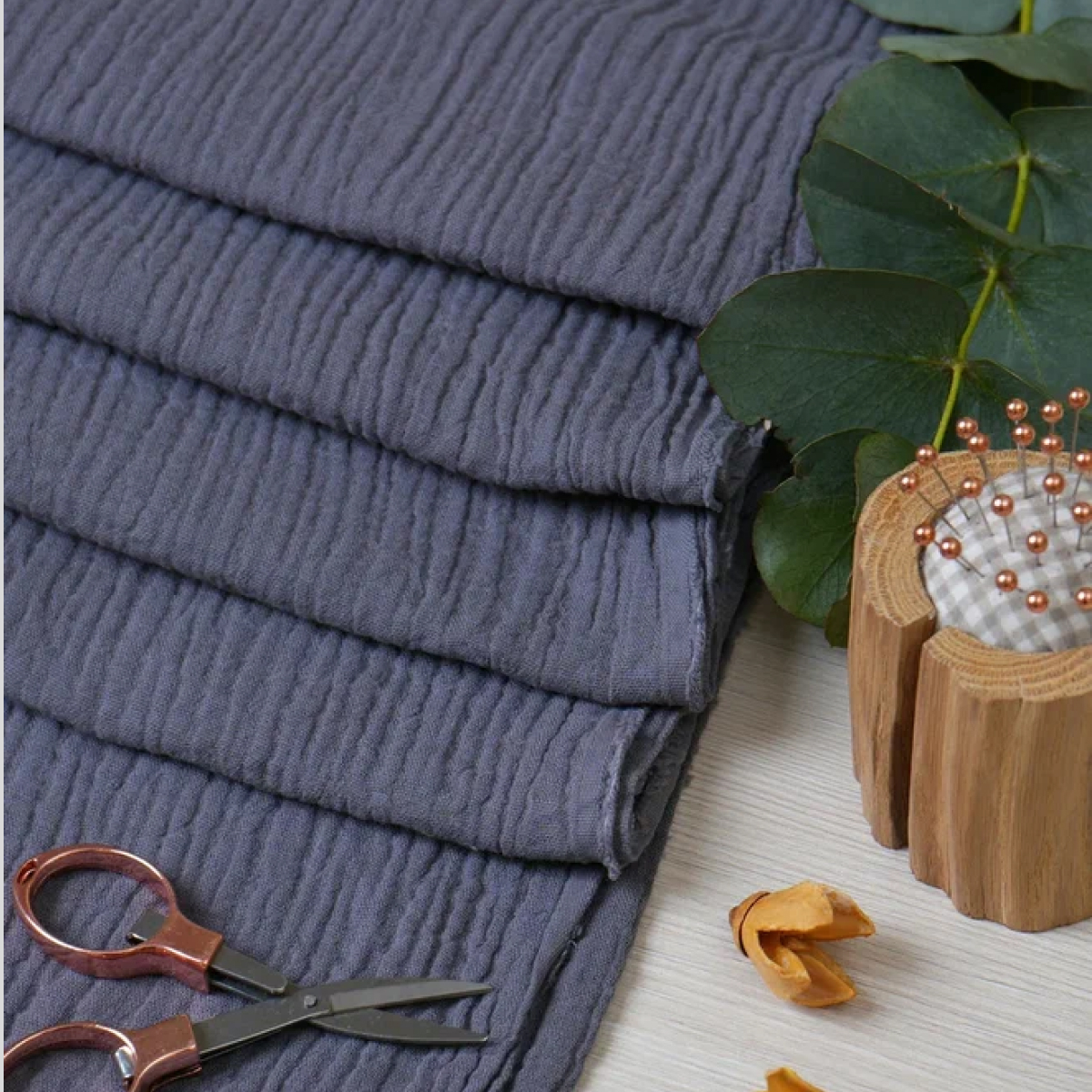 Муслин с двойной нитью  жатый — это очень нежный эко-хлопок для пошива воздушных летних платьев для взрослых и для детей, легких костюмов, мужских рубашек, стильных блуз, легких и мягких детских пеленок, комплектов постельного белья (покрывало, наволочки). Эта натуральная, полупрозрачная ткань идеальна для летней поры, она легкая и воздухопроницаемая.