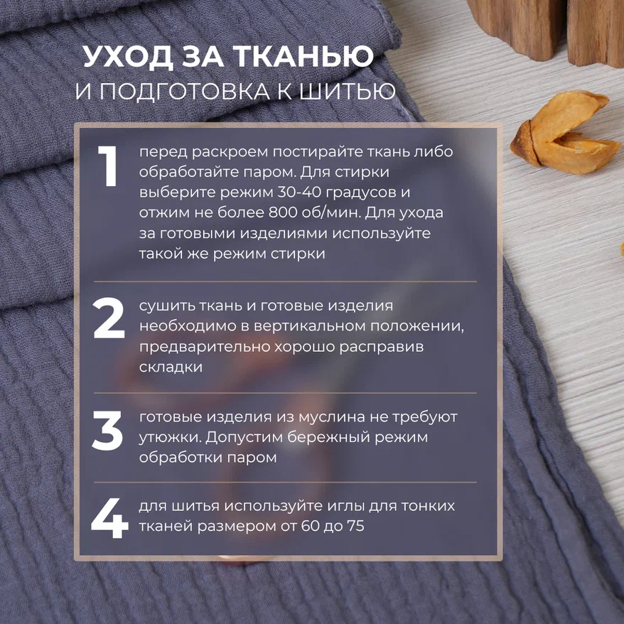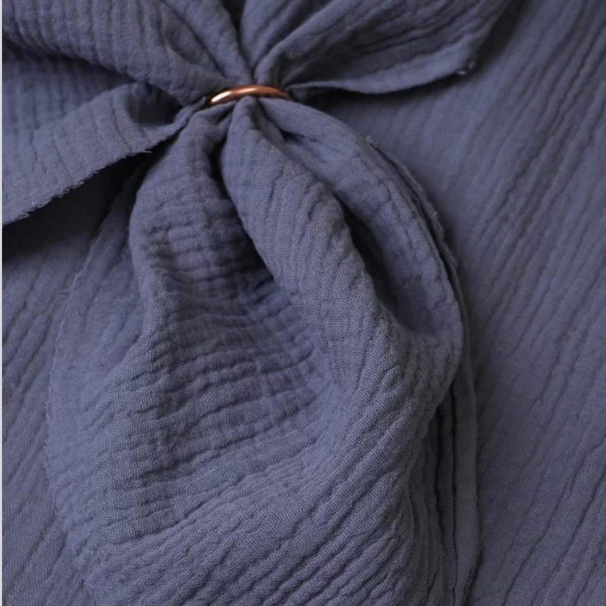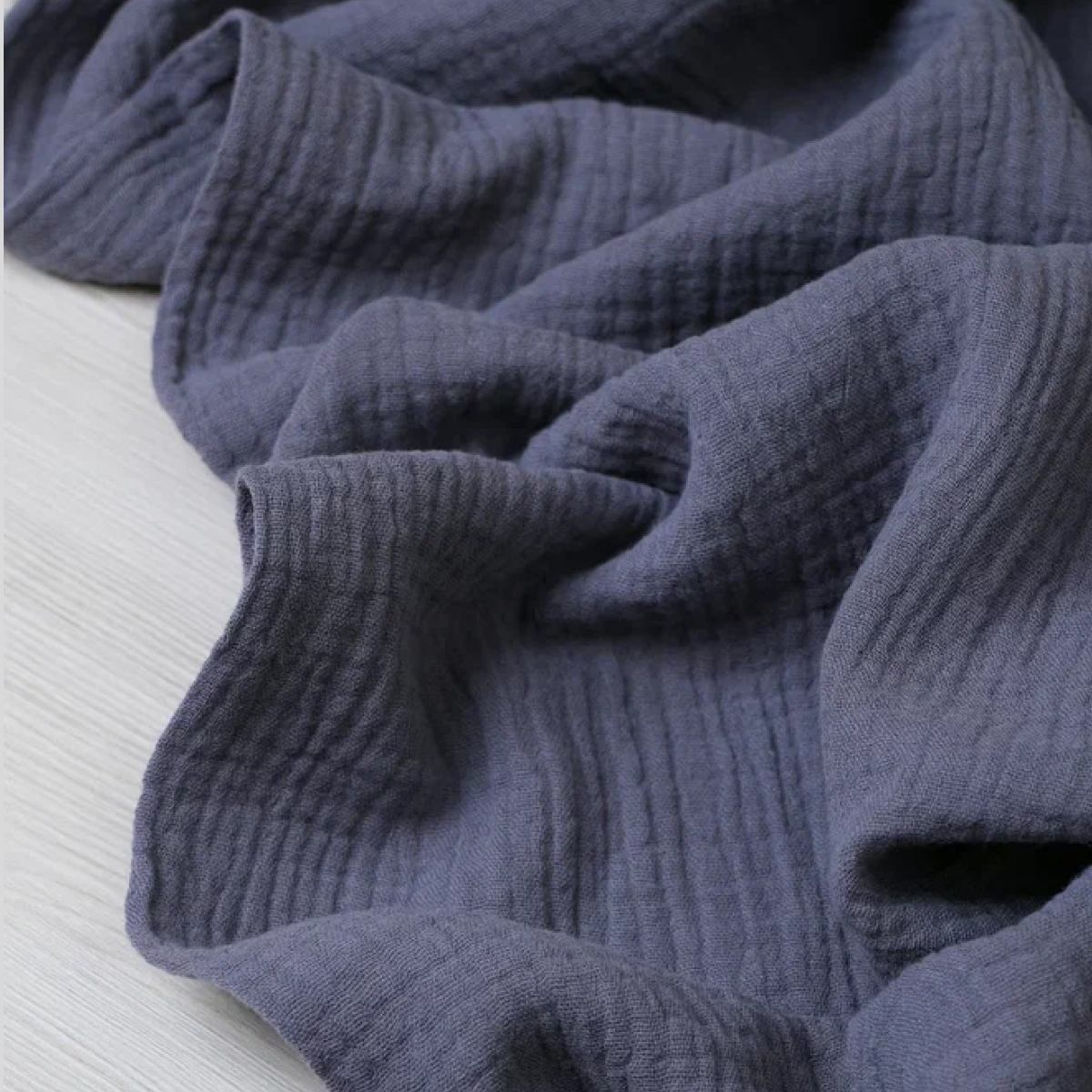 Муслин с двойной нитью  жатый — это очень нежный эко-хлопок для пошива воздушных летних платьев для взрослых и для детей, легких костюмов, мужских рубашек, стильных блуз, легких и мягких детских пеленок, комплектов постельного белья (покрывало, наволочки). Эта натуральная, полупрозрачная ткань идеальна для летней поры, она легкая и воздухопроницаемая.