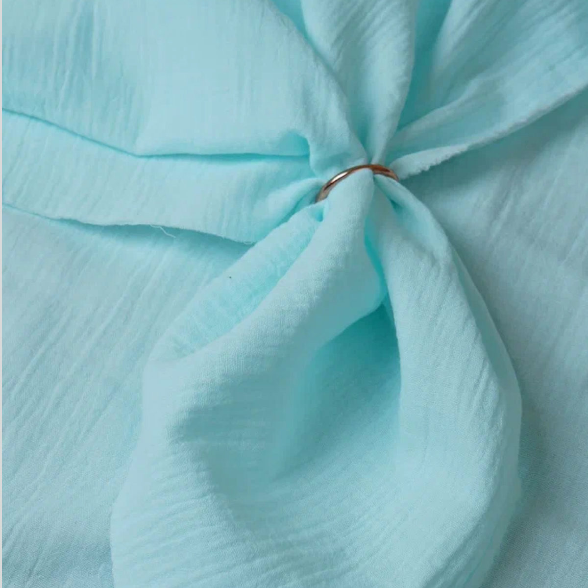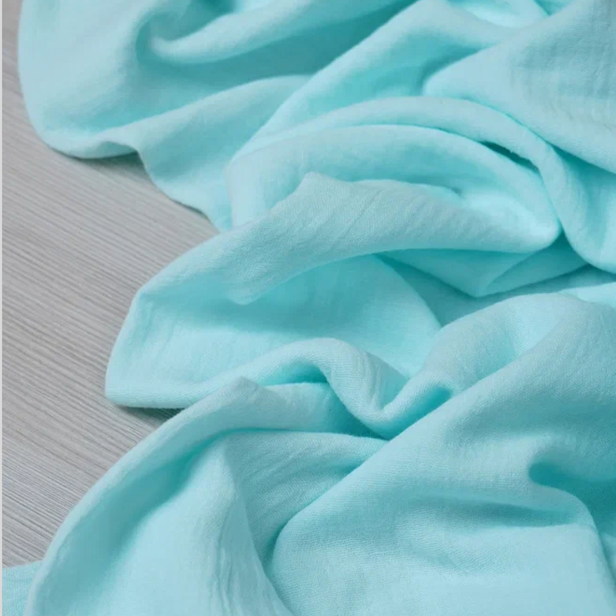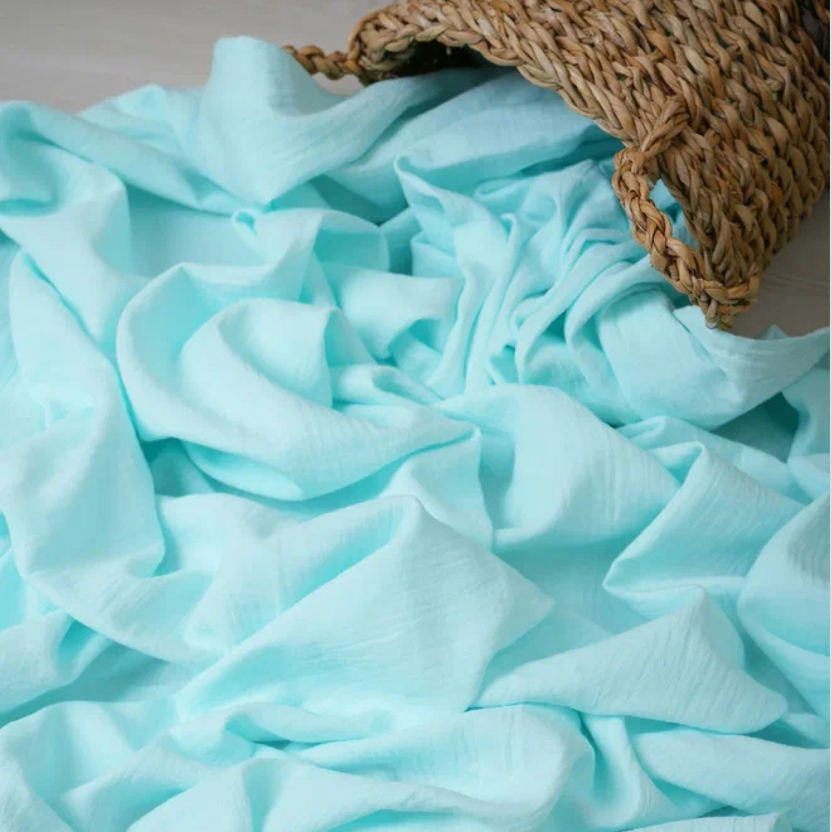 Муслин с двойной нитью  жатый — это очень нежный эко-хлопок для пошива воздушных летних платьев для взрослых и для детей, легких костюмов, мужских рубашек, стильных блуз, легких и мягких детских пеленок, комплектов постельного белья (покрывало, наволочки). Эта натуральная, полупрозрачная ткань идеальна для летней поры, она легкая и воздухопроницаемая.