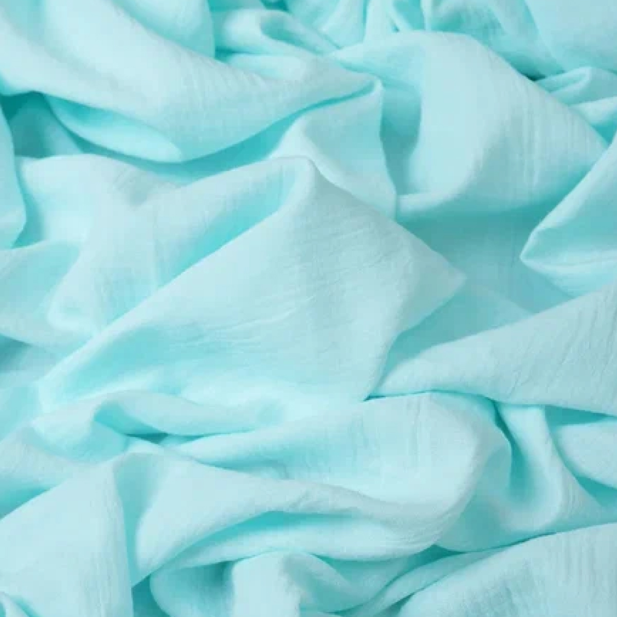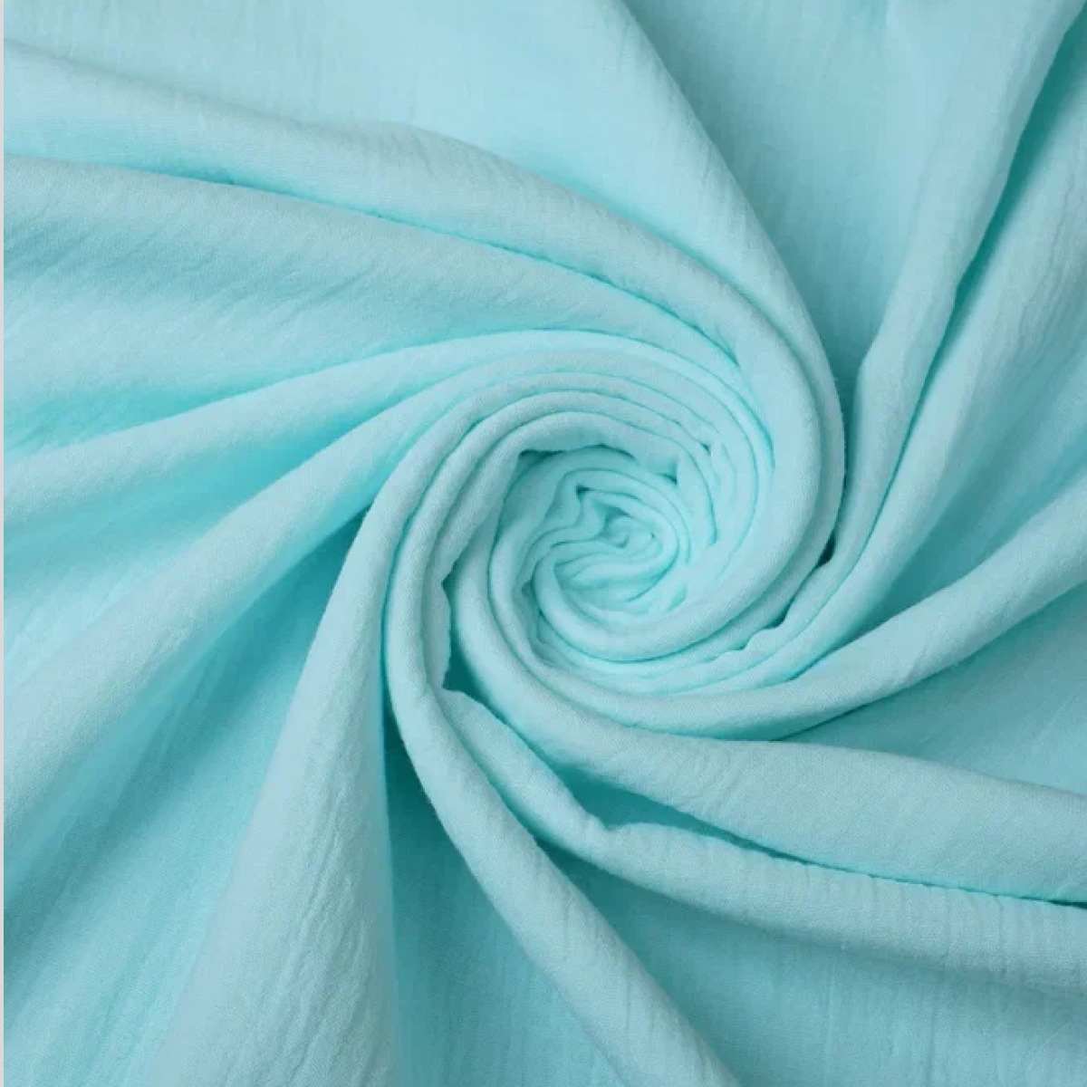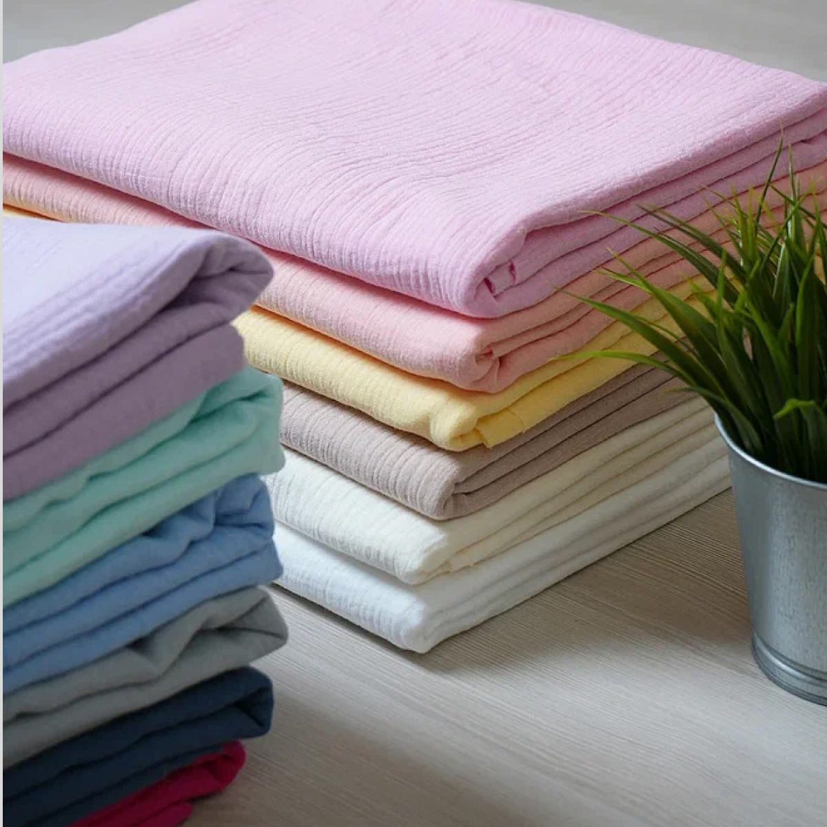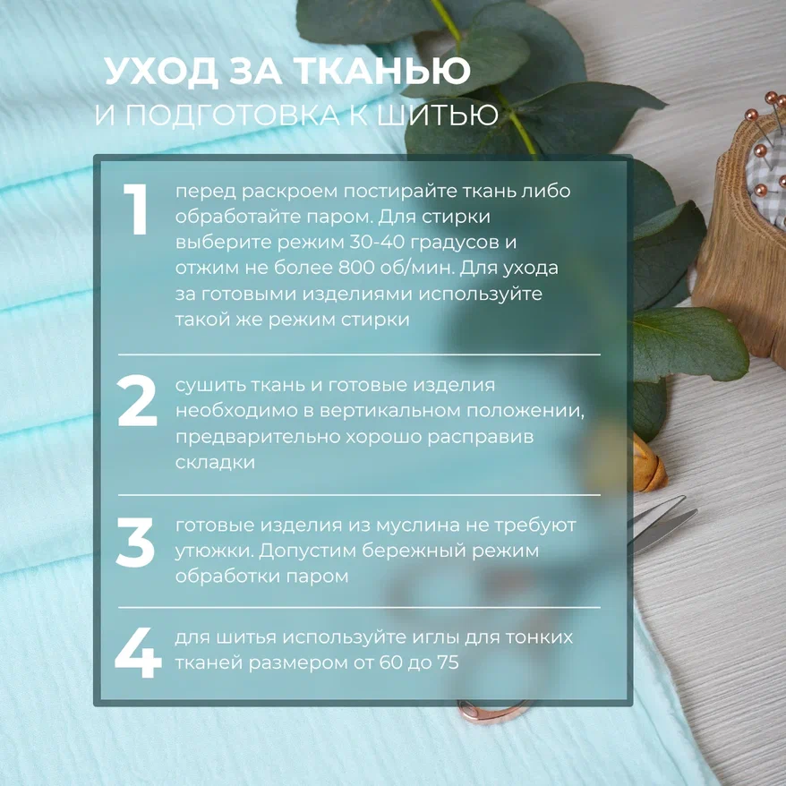 Муслин с двойной нитью  жатый — это очень нежный эко-хлопок для пошива воздушных летних платьев для взрослых и для детей, легких костюмов, мужских рубашек, стильных блуз, легких и мягких детских пеленок, комплектов постельного белья (покрывало, наволочки). Эта натуральная, полупрозрачная ткань идеальна для летней поры, она легкая и воздухопроницаемая.