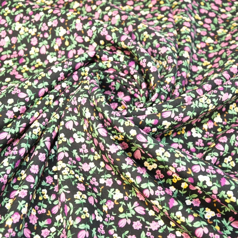 Штапель принт "Мелкий цветочек на черном фоне"