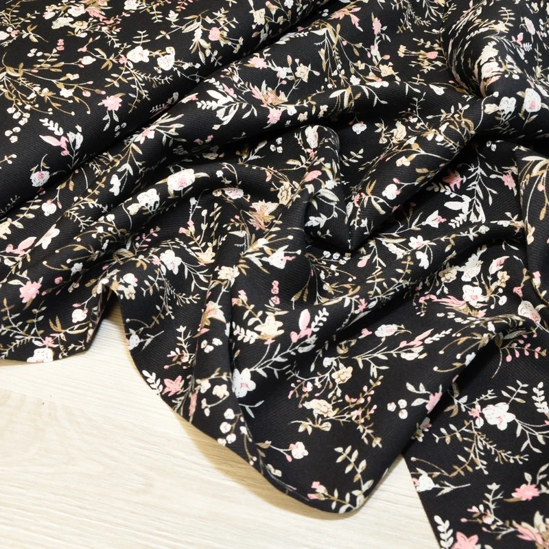 Штапель "Твил" "Веточки с цветами на черном фоне"