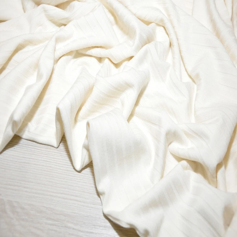 Трикотаж резинка представляет собой ряд выпуклых вертикальных полос из «косичек» с лицевой стороны. Он хорошо тянется, поэтому идеально сядет по фигуре. Используется в пошиве платьев, юбок, водолазок, особенно модных в этом сезоне.
